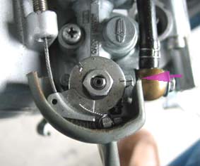 写真33 A1は オイルポンプレバーがストッパーから離れる瞬間にスロットルバルブが動き始めるように合わせるか 1ミリのプラ板をストッパーに挟んでおいて動き始める瞬間にスロットルバルブが動くように 調整します。 Aシリーズも 調整が終わってから アクセル全開にして スロットルバルブの下縁(カッタウェイ部分ではなく 奥の下縁)が上がりきっているかチェックします。 |